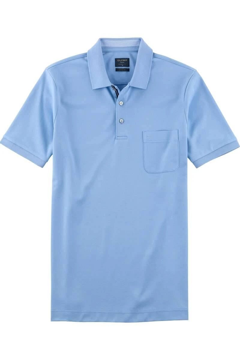 Schönes OLYMP Modern Fit Poloshirt in der Farbe hellblau, Einfarbig. Ein tolles, vielseitig kombinierbares Poloshirt von OLYMP, das sehr angenehm zu tragen ist. Das Material ist ein feines Jacquard-Gewebe aus 65% Baumwolle / 35% Polyester.