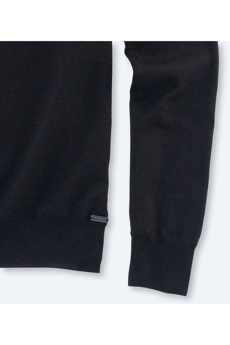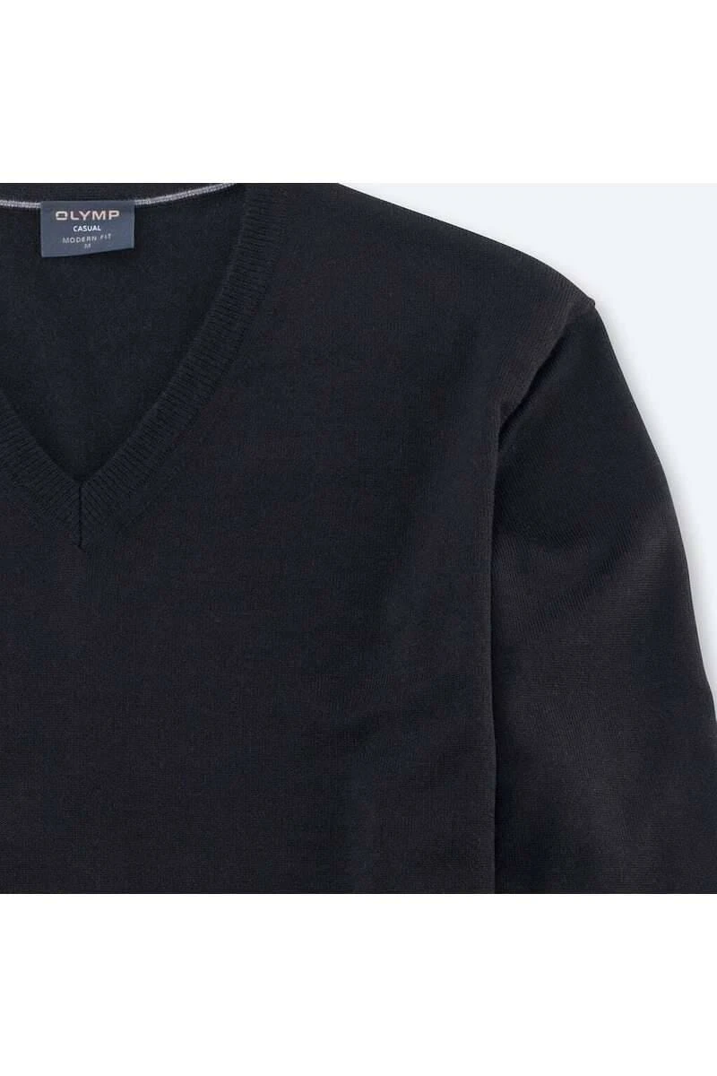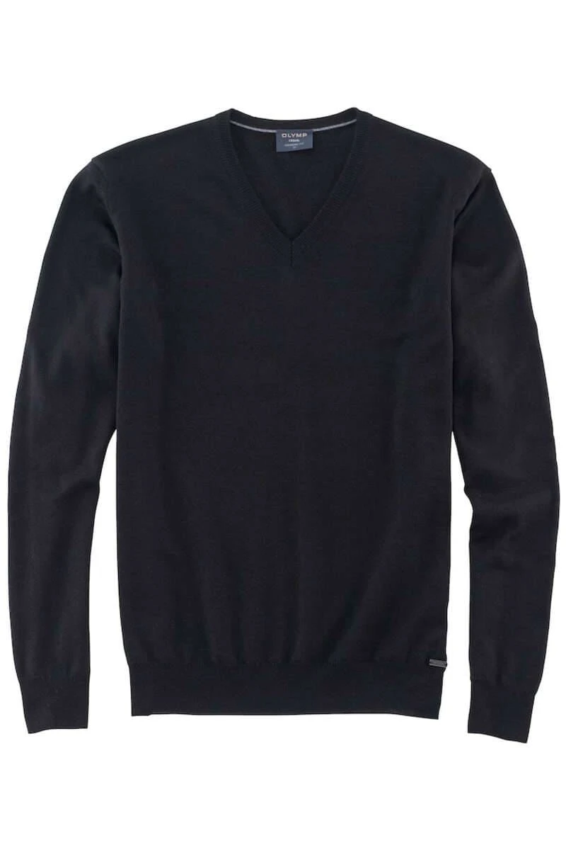 Hochwertiger Olymp-V-Ausschnitt aus 100% Merinowolle in klassischer Passform, Farbe schwarz – Einfarbig. Die hervorragende Verarbeitung bietet höchsten Tragekomfort und sorgt für eine tolle Formstabilität. Der Pullover kann durch seine spezielle Verarbeitung der Wolle sogar in der Waschmaschine gewaschen werden.