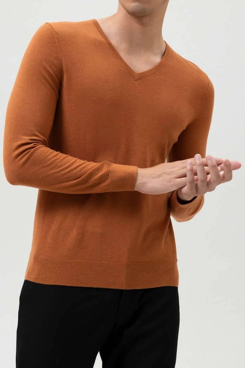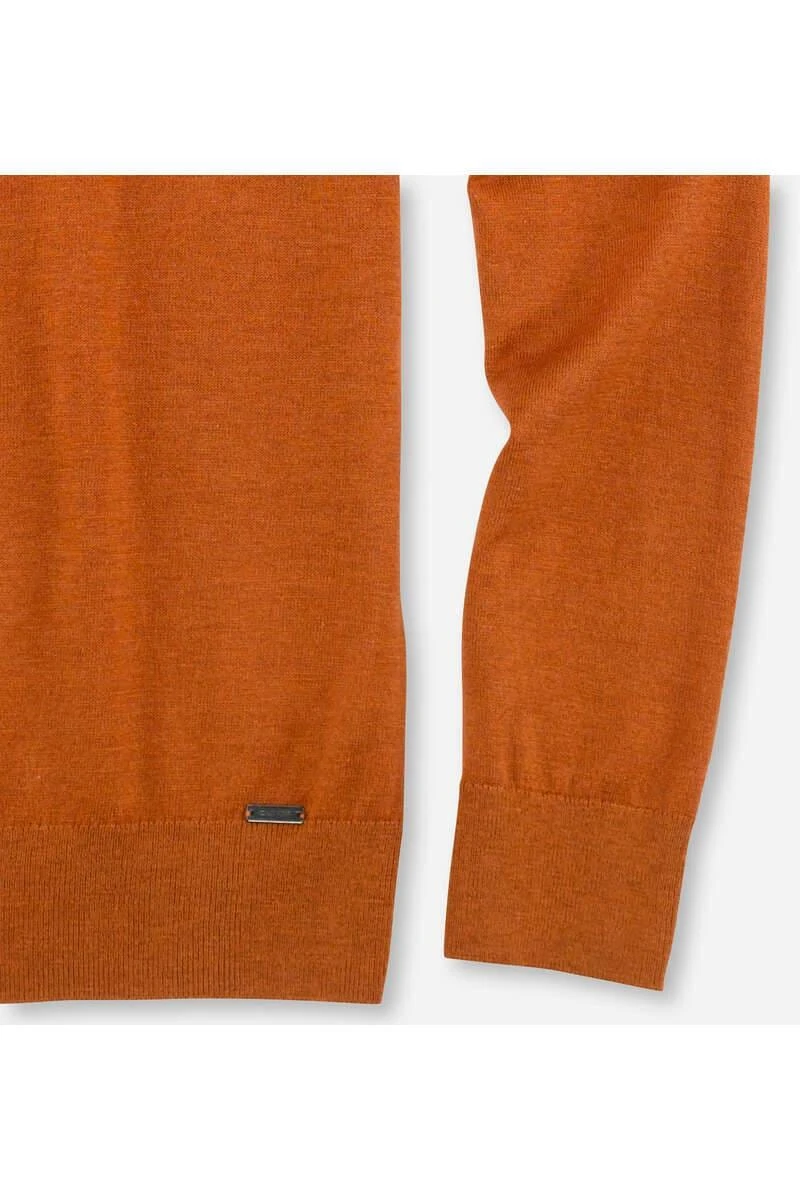 Hochwertiger OLYMP-Pullover aus 85% Schurwolle / 15% Seide in der beliebten, körperbetonten Body Fit Passform, Farbe mango – Einfarbig. Die hervorragende Verarbeitung bietet höchsten Tragekomfort und sorgt für eine tolle Formstabilität. Der Pullover kann durch seine spezielle Verarbeitung der Wolle sogar in der Waschmaschine gewaschen werden.